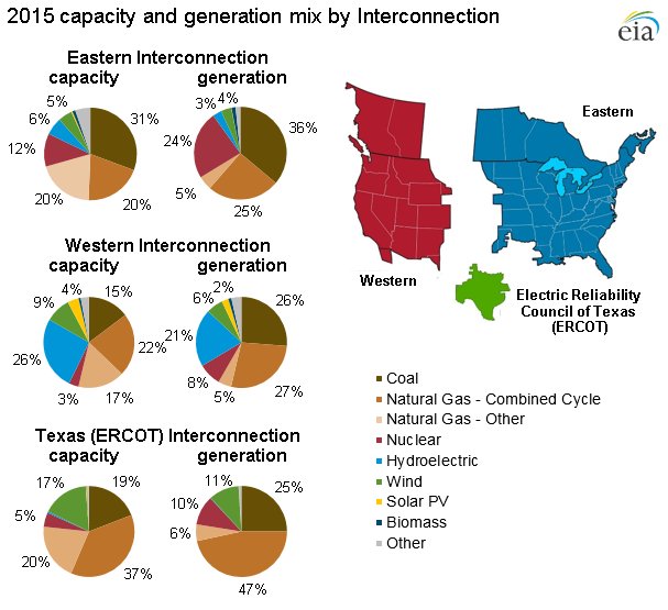 - Texas: natural gas (huge; almost 50% generation), coal, and wind; solar, still inconsequential