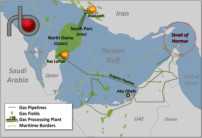 To begin to understand the importance of the conflict in Iran on LNG markets, first note that the world’s largest gas field lies in the Persian Gulf between Qatar and Iran. Iran claims the northern part (green-shaded area to upper-right of dashed yellow line in Figure 1 below), which they call South Pars, while Qatar controls the southern part (green-shaded area to lower-left of dashed yellow line), called the North Dome. (The naming is kind of upside-down, if you ask us.)